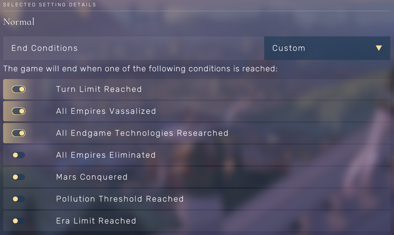 Players can set custom end game conditions under the “Pace” section of the menu when creating a new game.