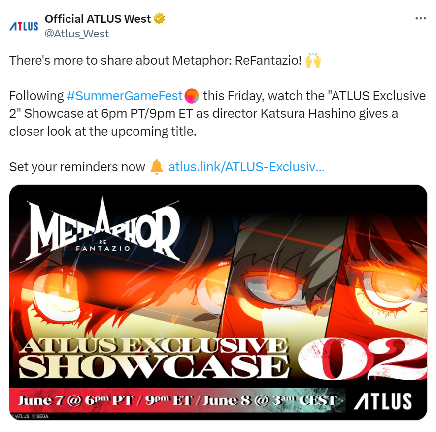 Early today, ATLUS announced there will be a Metaphor: ReFantazio presentation happening shortly after Summer Game Fest on Friday, June 7. You can find the information at this link, but below is a reproduction of the announcement.